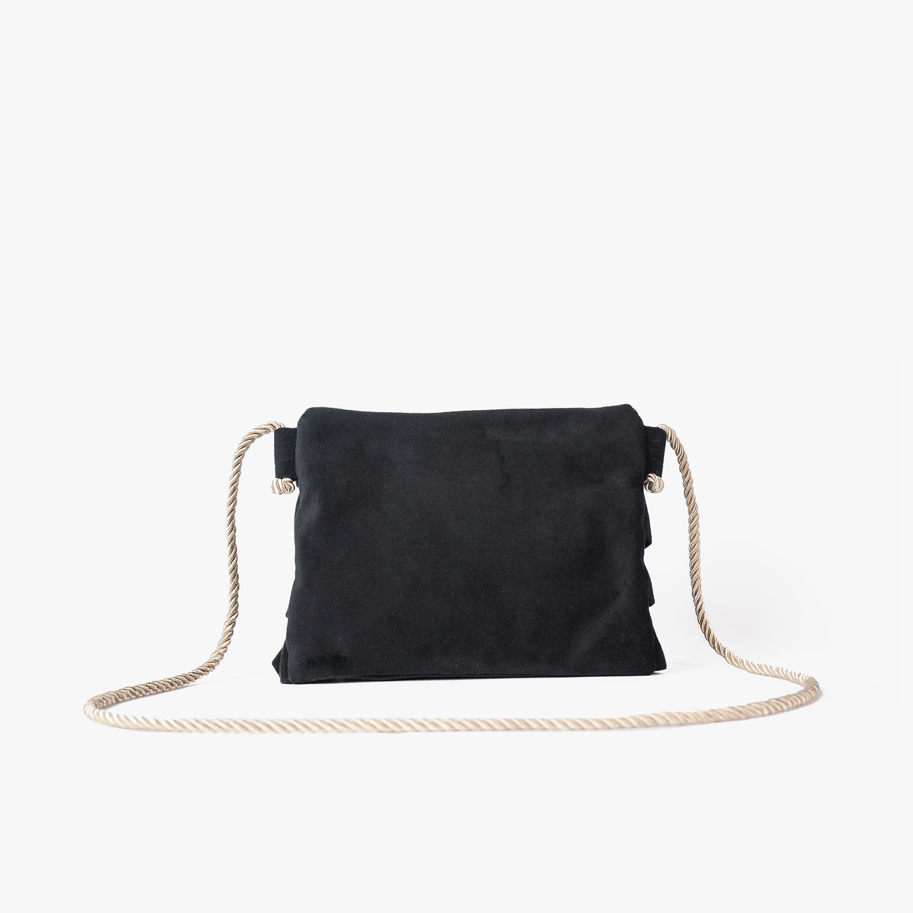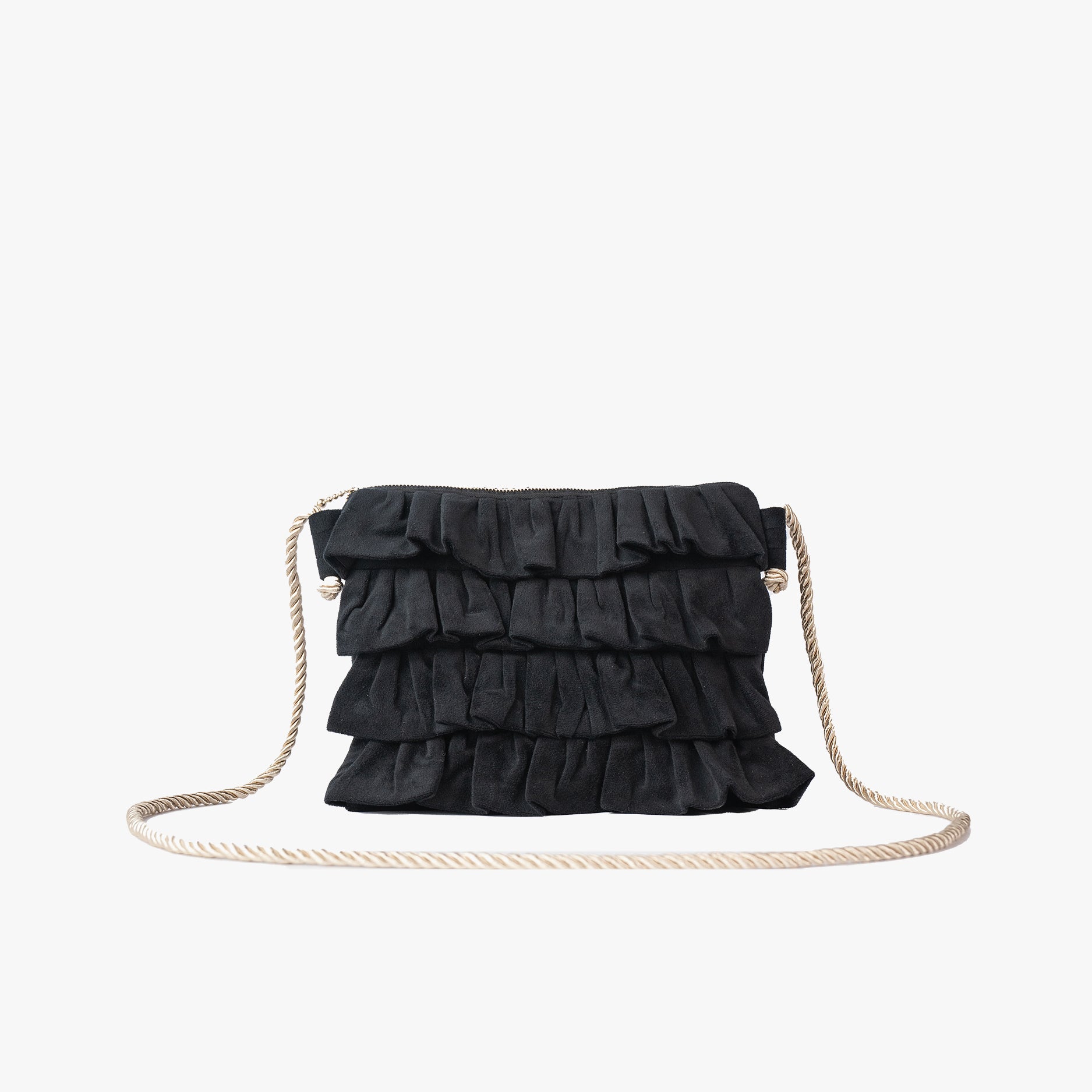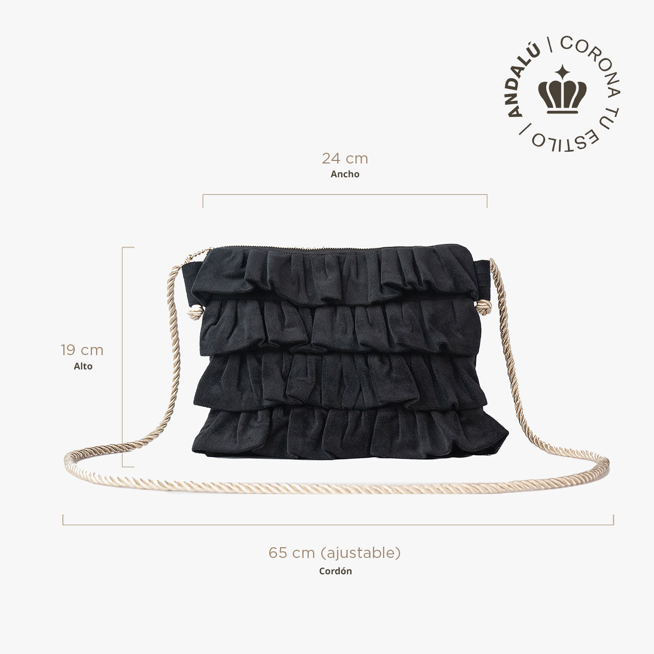 Su diseño con cuatro vuelos frontales crea un efecto visual dinámico y sofisticado, inspirado en el ritmo y la fuerza del baile flamenco. Su cordón dorado aporta un contraste moderno y distintivo, elevando aún más su carácter único. Espaciosa y cómoda, es ideal para llevar más que lo esencial. Además, cuenta con un bolsillo interior para mantener todo en orden.