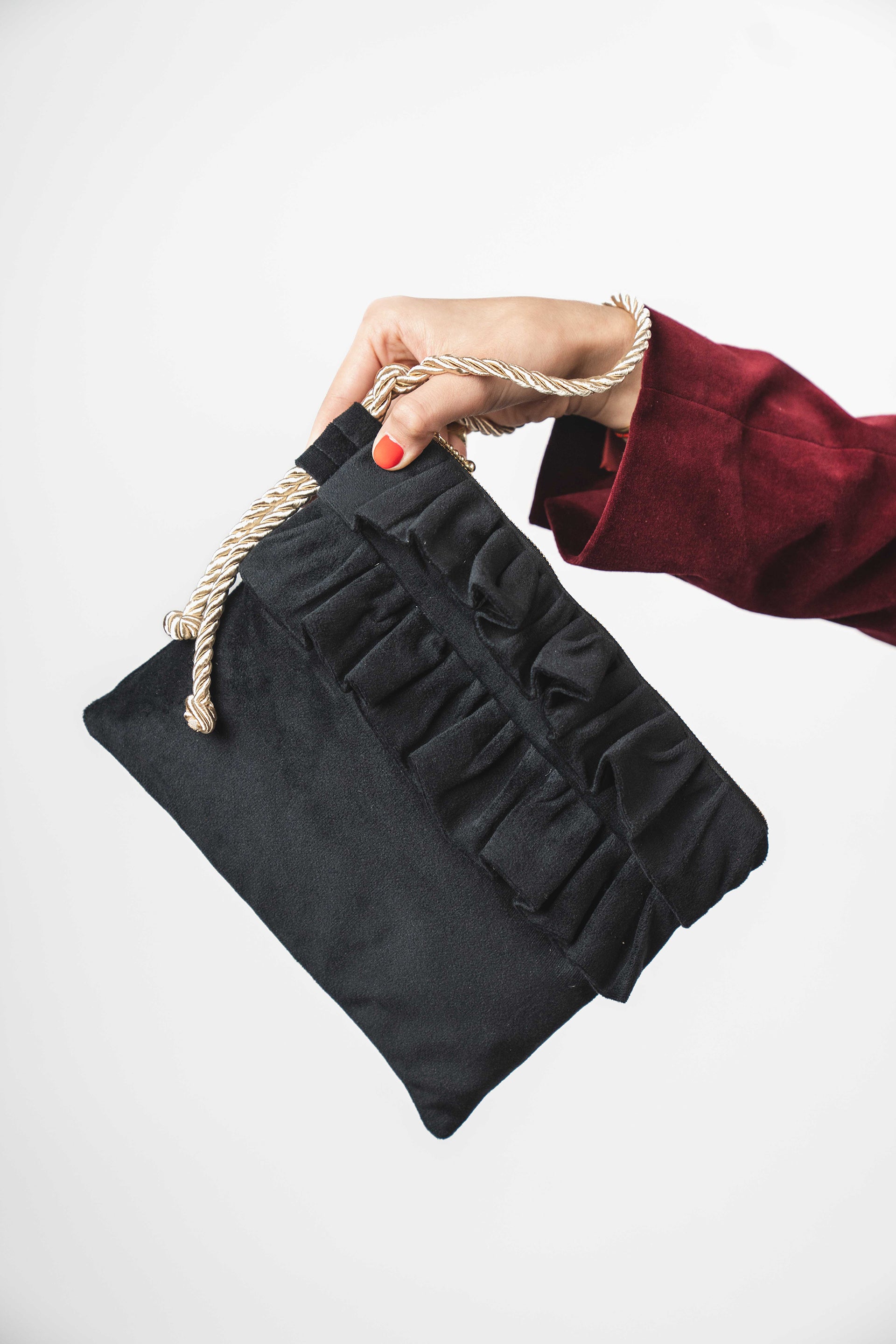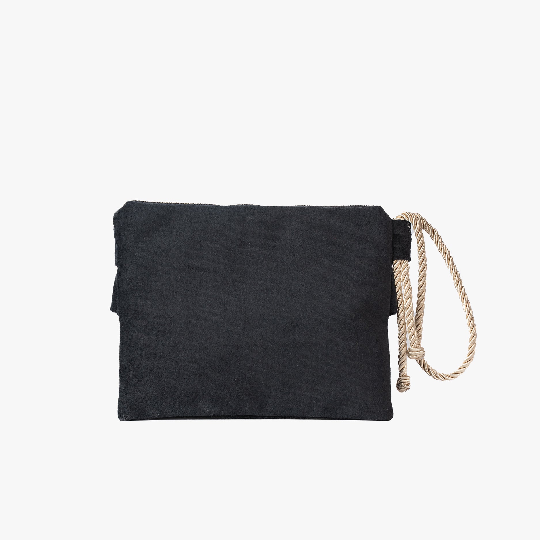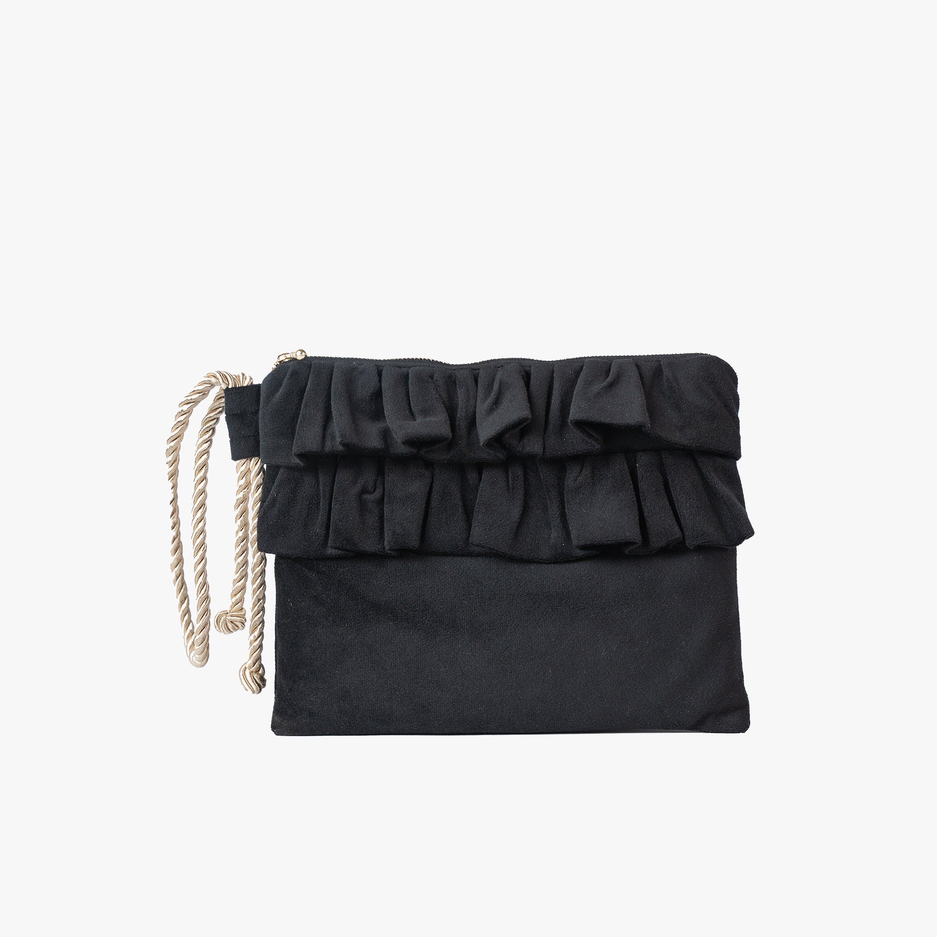 Sus dos vuelos frontales aportan textura y movimiento, mientras que su cordón dorado fijo permite llevarla cómodamente en la mano o colgada en la muñeca. Perfecta para tus esenciales del día o la noche. Además, cuenta con un bolsillo interior que mejora su funcionalidad sin perder estilo.
