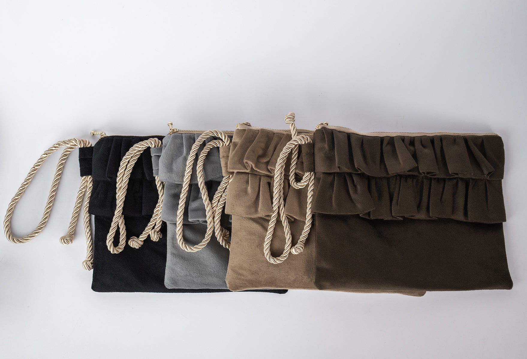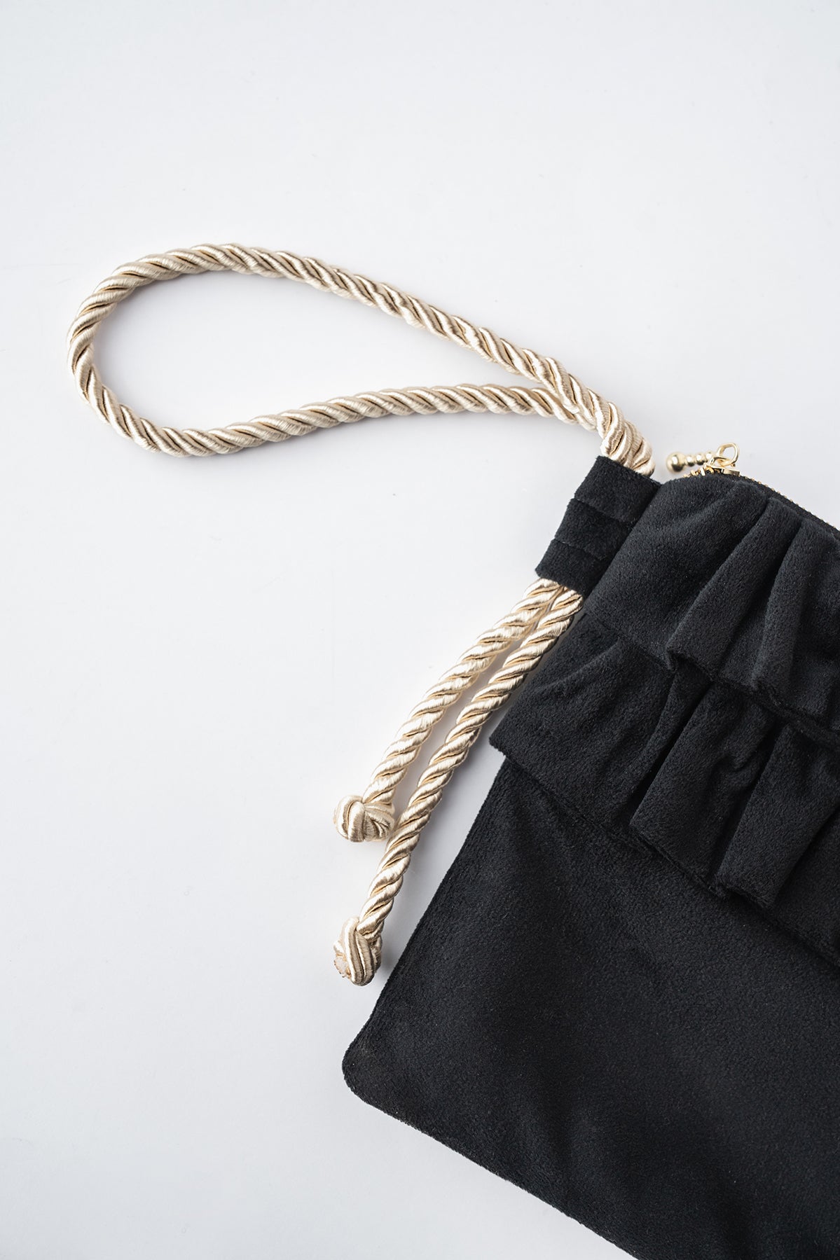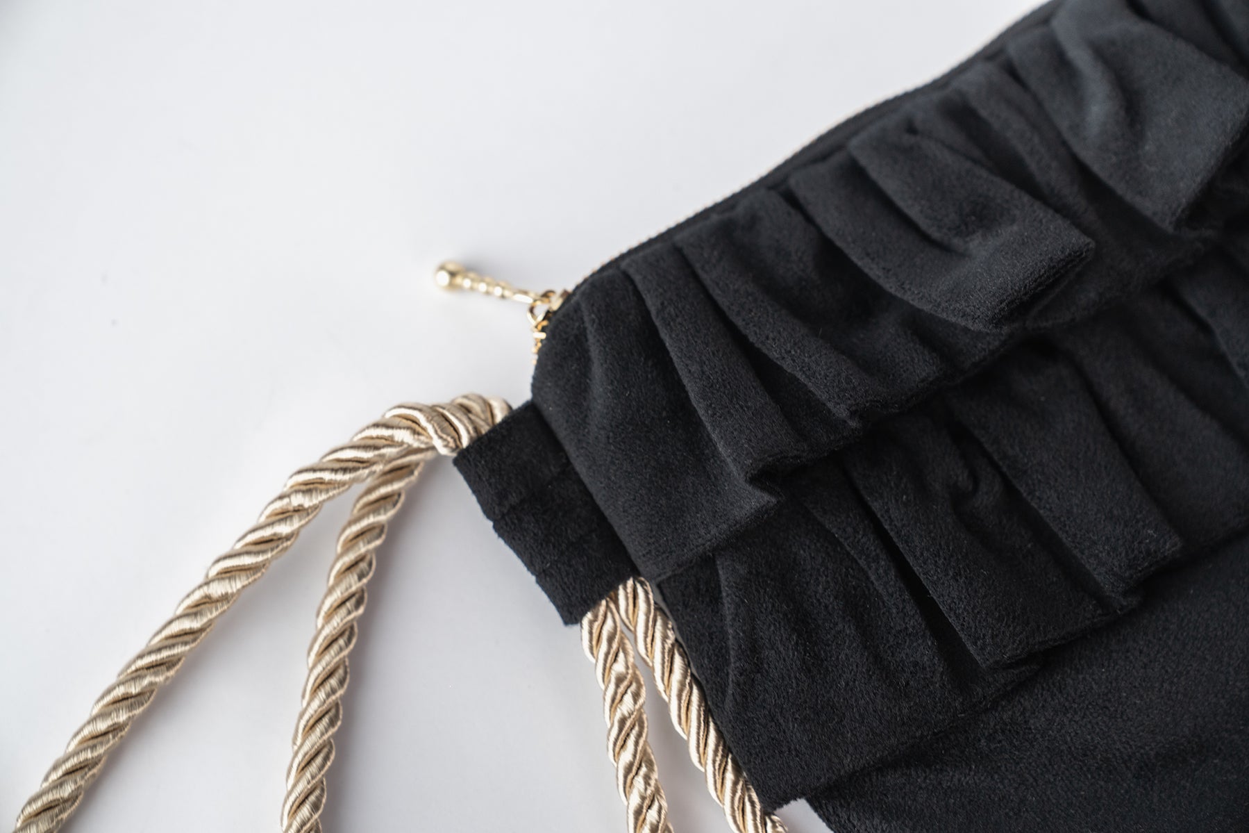 Sus dos vuelos frontales aportan textura y movimiento, mientras que su cordón dorado fijo permite llevarla cómodamente en la mano o colgada en la muñeca. Perfecta para tus esenciales del día o la noche. Además, cuenta con un bolsillo interior que mejora su funcionalidad sin perder estilo.