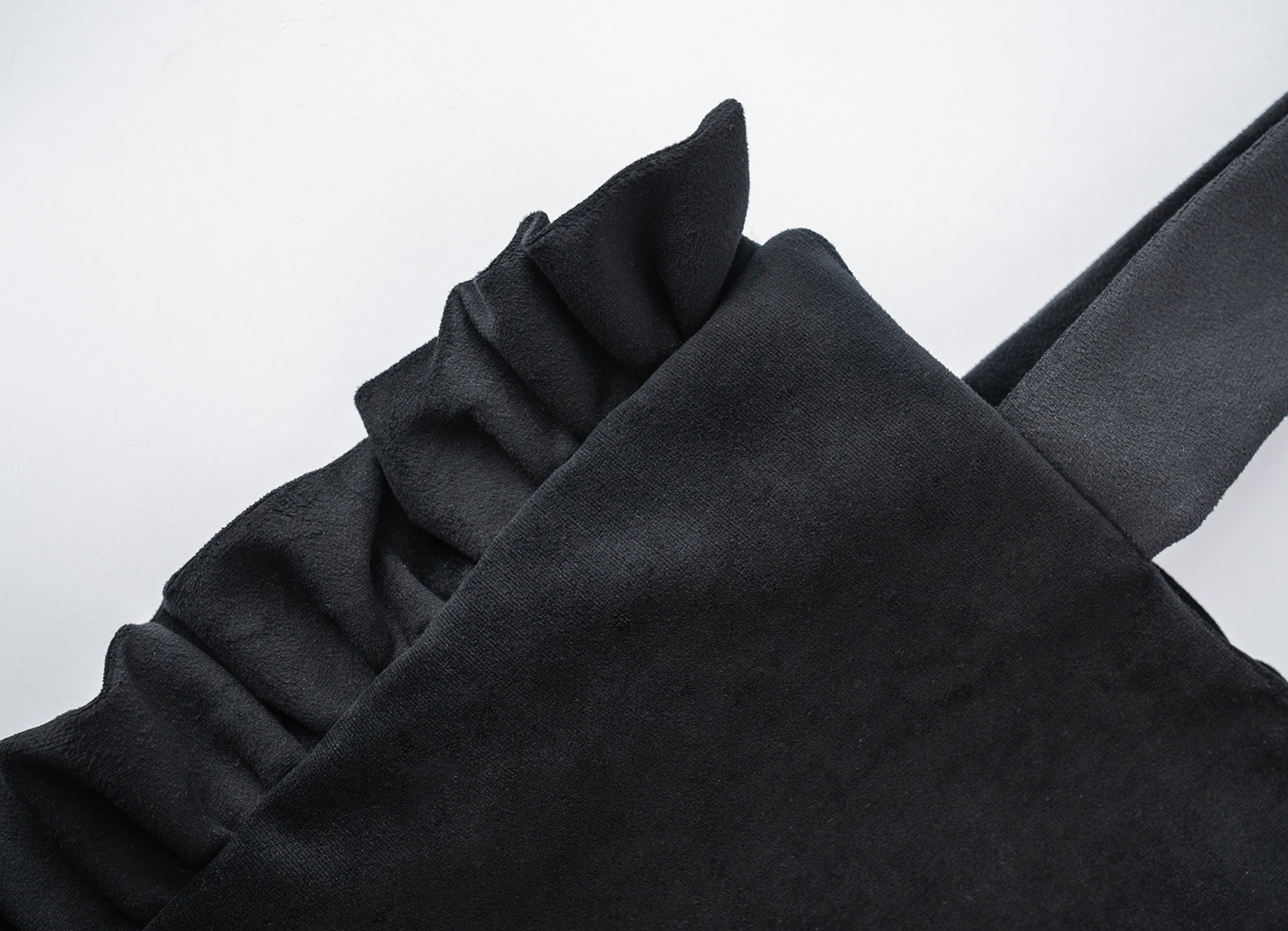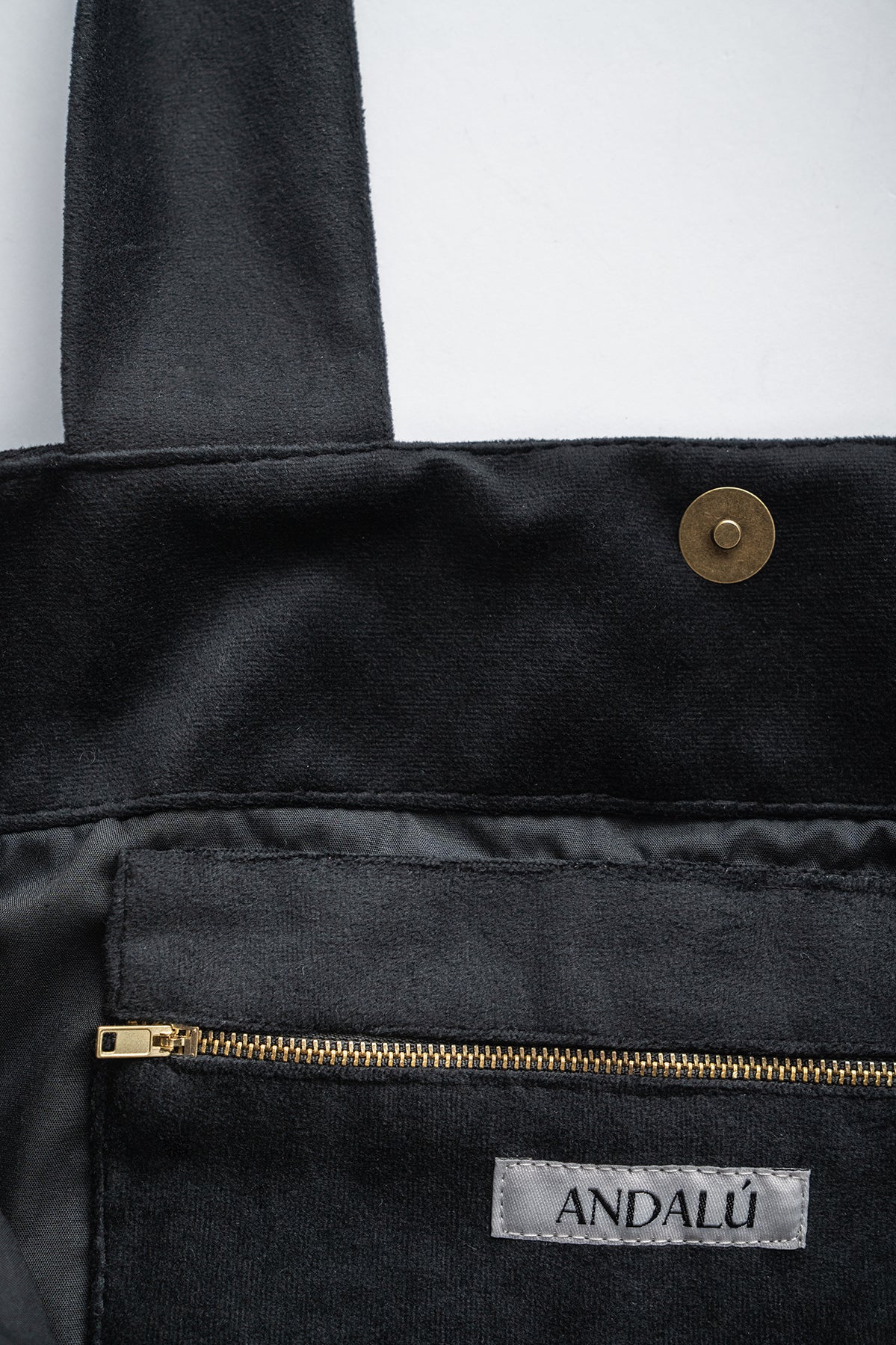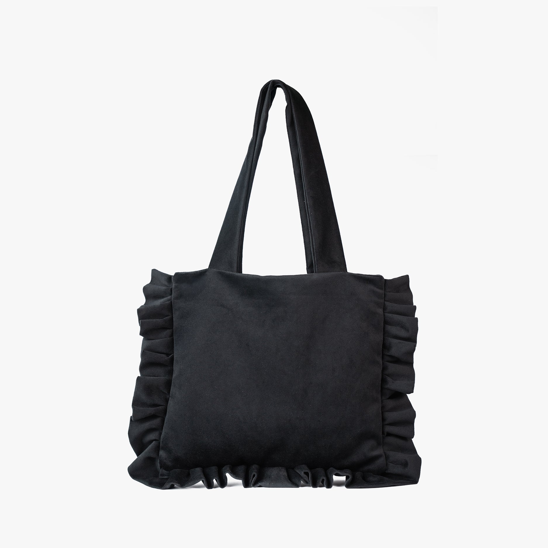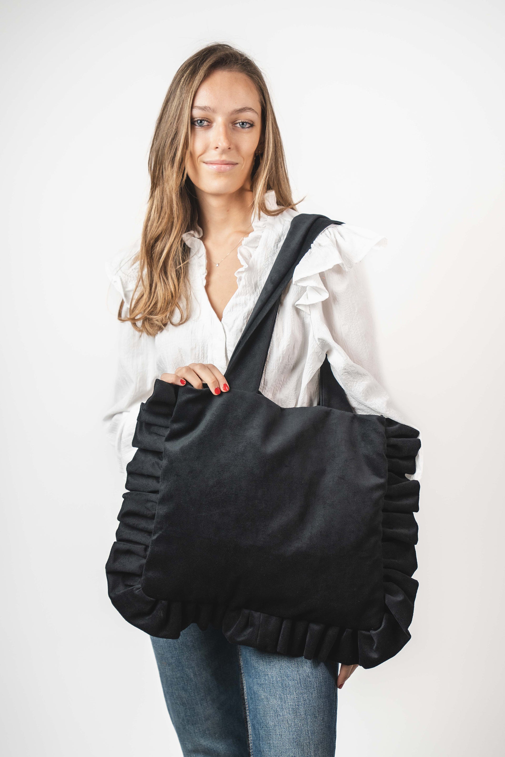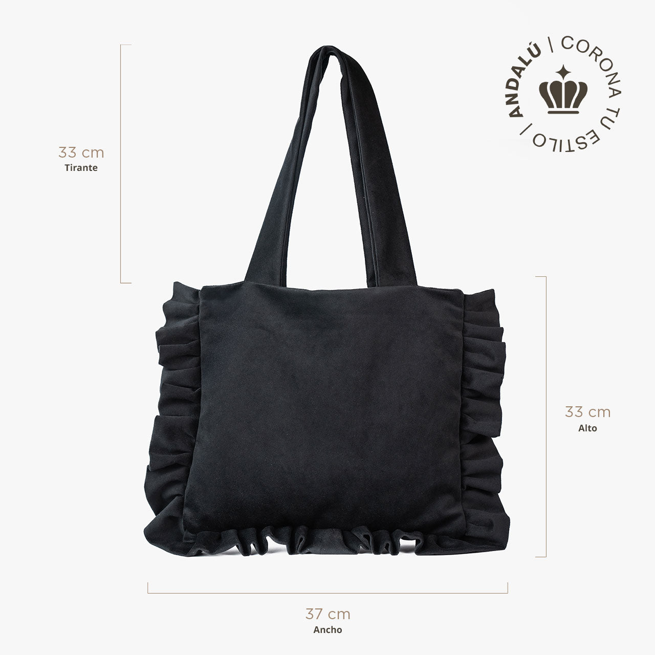 Sutil, femenina y con estilo envolvente. La Valencia Negra es una tote bag que destaca por su diseño con vuelos en los bordes que enmarcan toda la silueta, logrando una presencia llamativa sin perder elegancia.